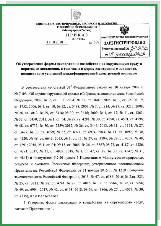 Приказ Минприроды России от 11.10.2018 г. № 509 «Об утверждении формы декларации о воздействии на окружающую среду и порядка ее заполнения, в том числе в форме электронного документа, подписанного усиленной квалифицированной электронной подписью»
