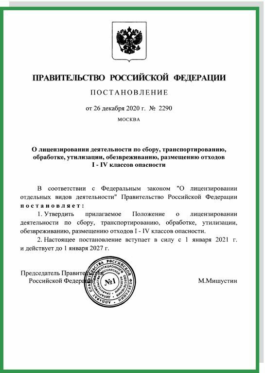 Постановление Правительства РФ от 26.12.2020 N 2290 (ред. от 13.04.2022) "О лицензировании деятельности по сбору, транспортированию, обработке, утилизации, обезвреживанию, размещению отходов I - IV классов опасности"