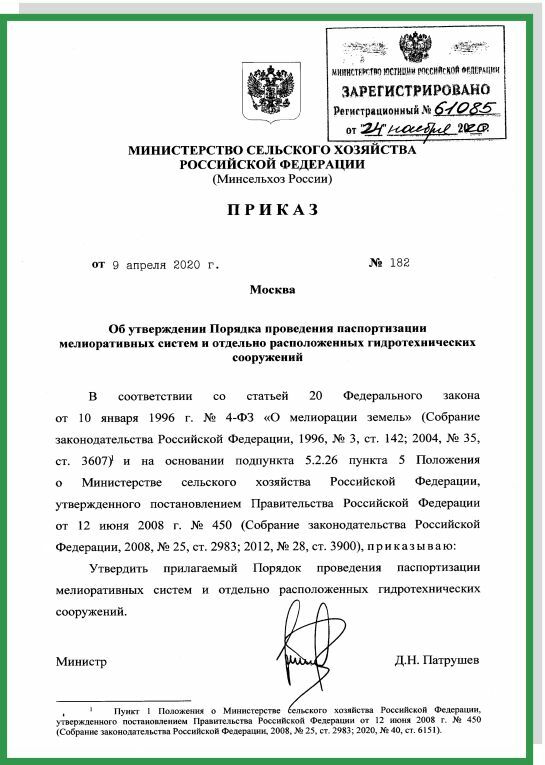 - Приказ Минсельхоза России от 09.04.2020 N 182 Об утверждении Порядка проведения паспортизации мелиоративных систем и отдельно расположенных гидротехнических сооружений