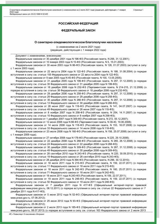 ФЗ «О санитарно-эпидемиологическом благополучии населения» от 30.03. 99 № 52-ФЗ
