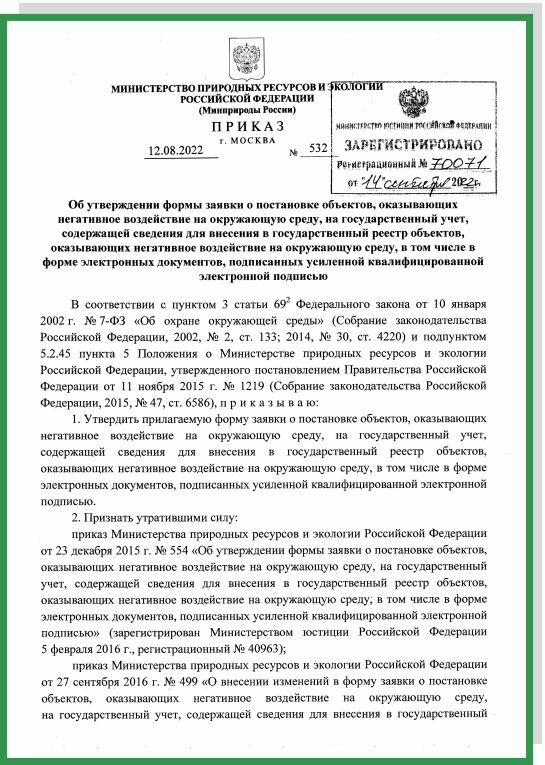 Приказ Министерства природных ресурсов и экологии Российской Федерации от 12.08.2022 № 532 "Об утверждении формы заявки о постановке объектов, оказывающих негативное воздействие на окружающую среду, на государственный учет, содержащей сведения для внесения в государственный реестр объектов, оказывающих негативное воздействие на окружающую среду, в том числе в форме электронных документов, подписанных усиленной квалифицированной электронной подписью"