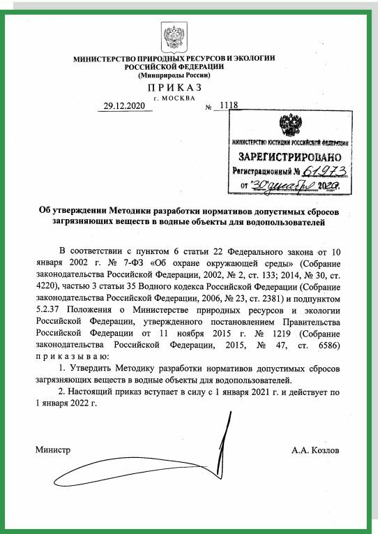 Приказ Минприроды России от 29.12.2020 N 1118 (ред. от 17.05.2021) "Об утверждении Методики разработки нормативов допустимых сбросов загрязняющих веществ в водные объекты для водопользователей"