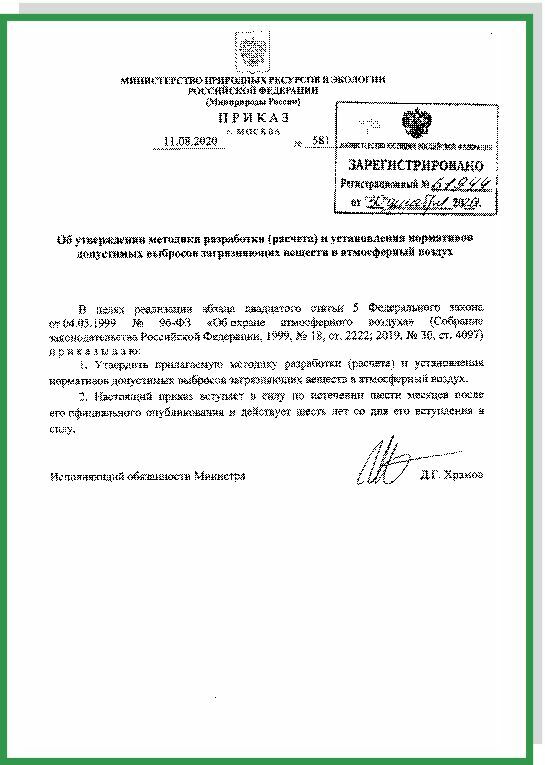 Приказ Минприроды России от 11.08.2020 г. № 581 «Об утверждении методики разработки (расчета) и установления нормативов допустимых выбросов загрязняющих веществ в атмосферный воздух»