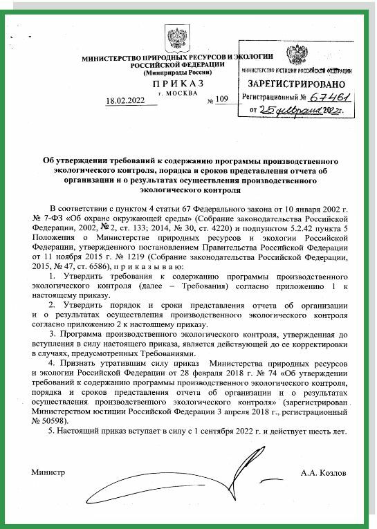 Приказ от 18 февраля 2022 года №109 «Об утверждении требований к содержанию программы производственного экологического контроля, порядка и сроков представления отчета об организации и о результатах осуществления производственного экологического контроля»