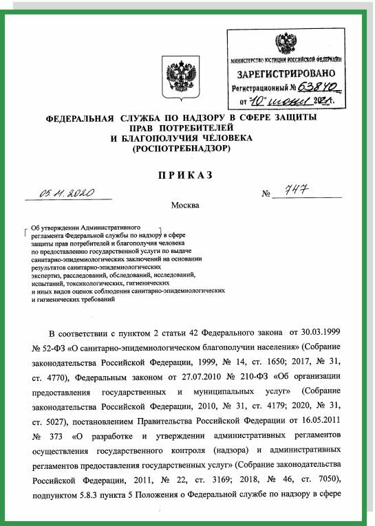 Приказ Роспотребнадзора от 05.11.2020 N 747 "Об утверждении Административного регламента Федеральной службы по надзору в сфере защиты прав потребителей и благополучия человека по предоставлению государственной услуги по выдаче санитарно-эпидемиологических заключений на основании результатов санитарно-эпидемиологических экспертиз, расследований, обследований, исследований, испытаний, токсикологических, гигиенических и иных видов оценок соблюдения санитарно-эпидемиологических и гигиенических требований" (Зарегистрировано в Минюсте России 10.06.2021 N 63840)
